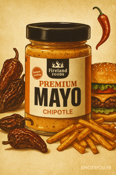 Chaleur 3/10 - Mayonnaise hyper onctueuse premium, légérement pimentée avec le goût fumée du piment Chipotle. Indispensable dans les sandwichs, burgers, avec les frites, le poisson, les trempettes, ect.