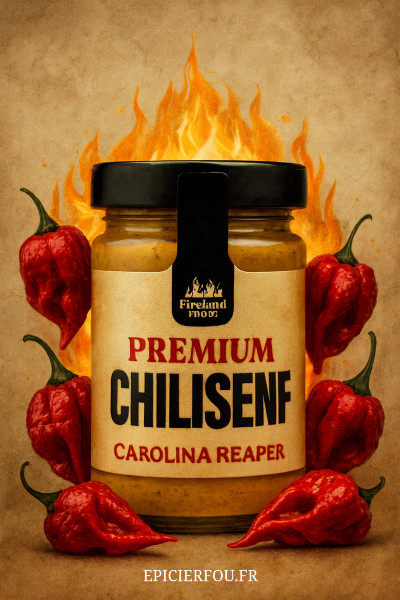 Chaleur 8/10 - Moutarde artisanale au Carolina Reaper (8/10) : couleur naturelle au curcuma, goût unique et intensité extrême. Un condiment infernal pour burgers, grillades et dips réservés aux vrais amateurs de piquant.